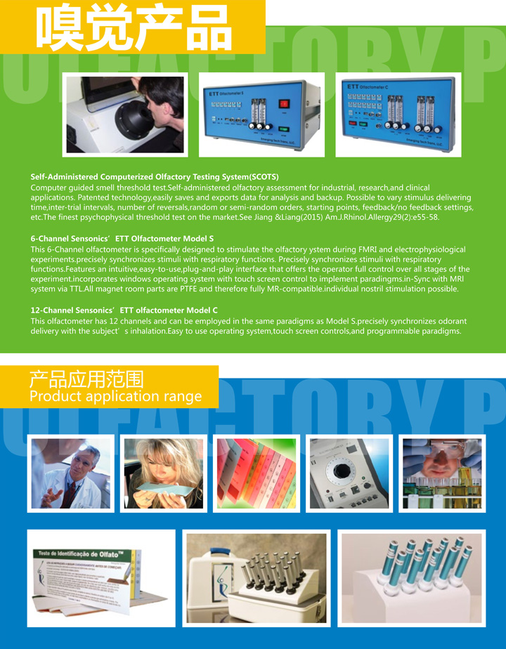 一種快速有效5分鐘篩查測試。12項版本的嗅覺識別測試用于在5分鐘內(nèi)快速查出嗅覺喪失情況。 如人口和一般工廠調(diào)查。這些氣味可用于在大多數(shù)習(xí)俗下。氣味使用如下:香蕉,巧克力,肉桂,汽油,檸檬,洋蔥,油漆稀釋劑,菠蘿,玫瑰,肥皂,煙和松節(jié)油。